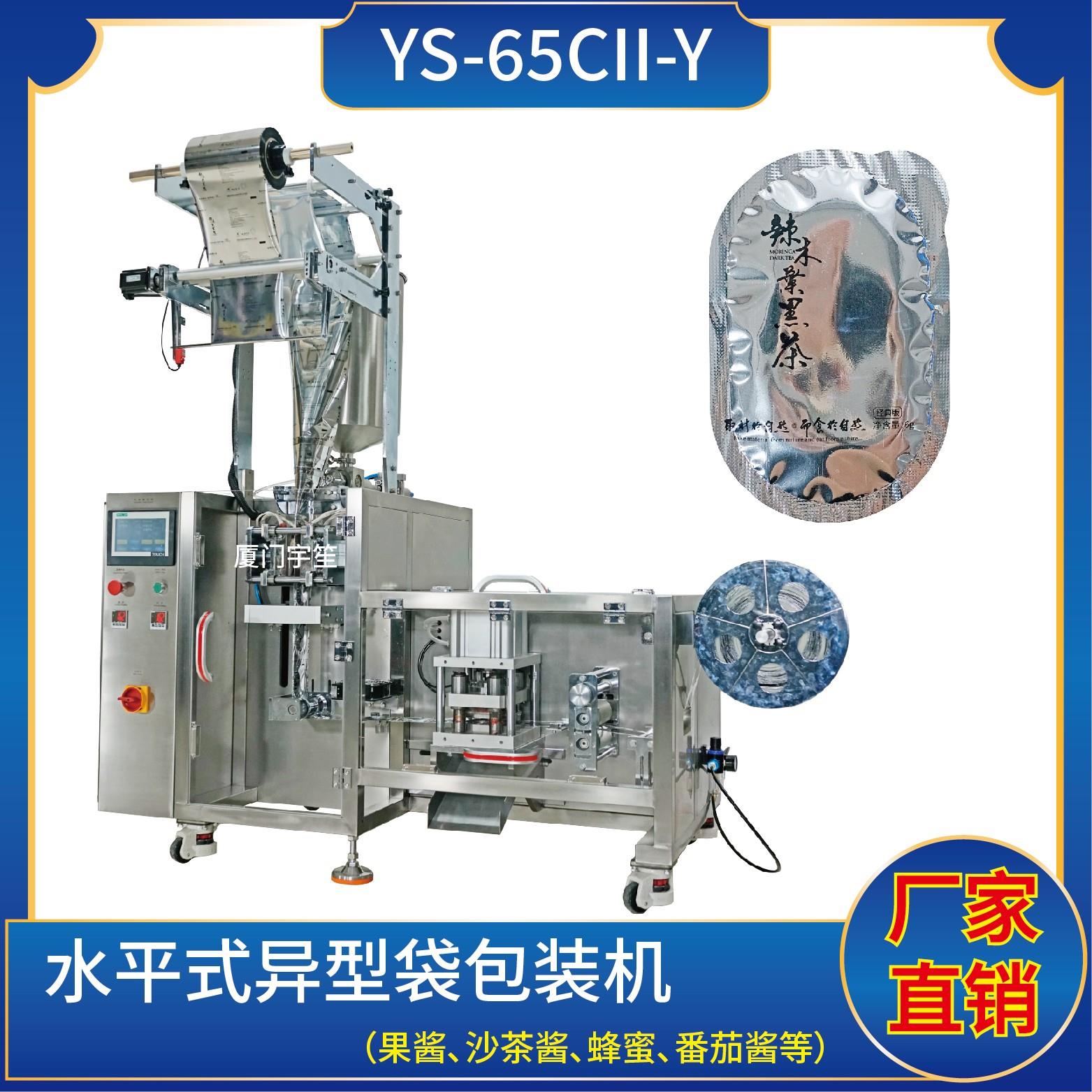 YS-65CII-Y 水平式異型袋包裝機 (使用鍍鋁、塑膠膜包裝)特點:1、適用于食品行業(yè)顆粒、粉劑、液體、醬料等物料的計量包裝。2、可自動完成制袋、計量、下料、封合、分切、計數(shù),可根據(jù)客戶要求配置打印批號等功能。3、采用觸摸屏操作PLC控制,驅(qū)動步進電機控制袋長,性能穩(wěn)定、調(diào)整方便、檢測準確。智能式溫控儀,PID調(diào)…