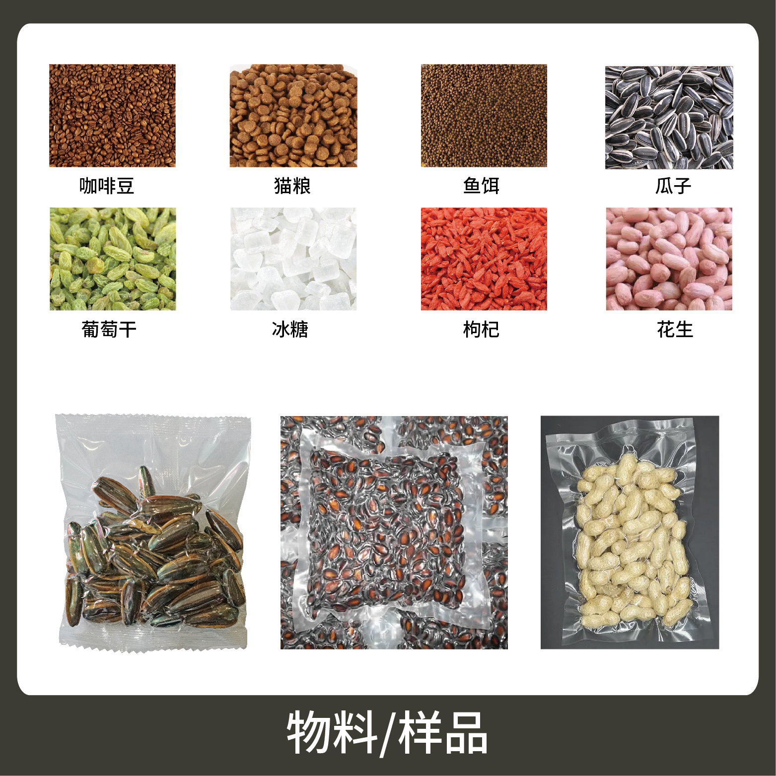 1、適用于食品行業(yè)中干果、炒貨、干菜等顆粒物品的真空計(jì)量包裝,防止食品的霉腐變質(zhì),保持食品的色香味,延長(zhǎng)保質(zhì)期。