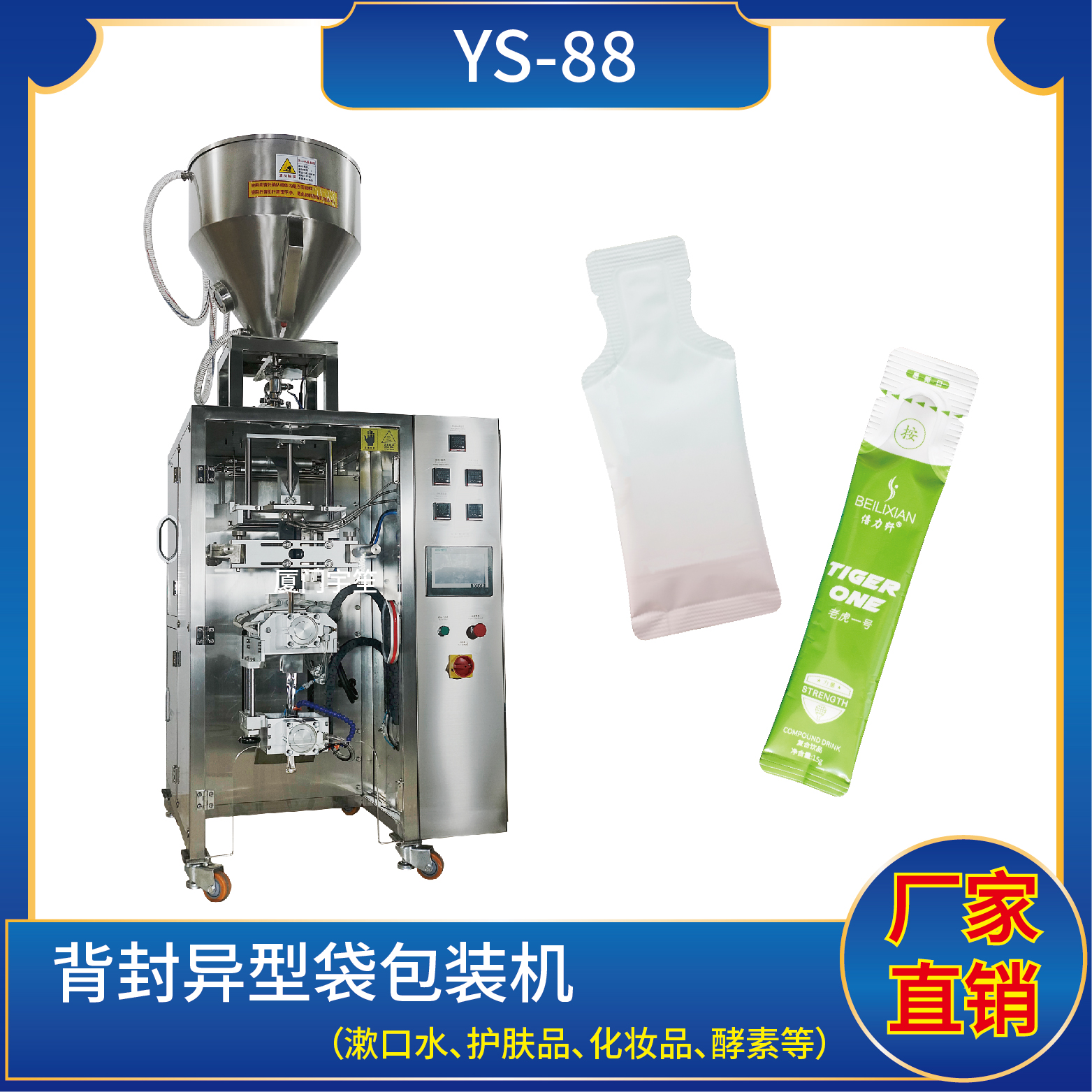 1、適用于各行業(yè)中酵素、果汁、漱口水、洗護用品、染發(fā)劑、化妝品小樣等醬料、液體物品的異形袋計量包裝。